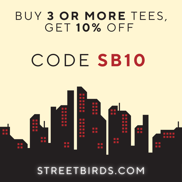 Enter your email address in the Subscribe to StreetBirds section and we'll let you know how to apply the discount. Boo ya!